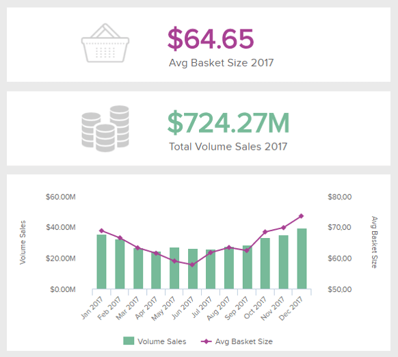 Giả sử, công ty bạn hoạt động trong lĩnh vực bán lẻ, và công ty sẽ muốn biết mình nên bán sản phẩm/dịch vụ gì, ở đâu, khi nào? Nhìn vào dashboard trên, xu hướng tăng giảm của khối lượng hàng bán (volume sales) sẽ phản ánh nhu cầu về sản phẩm - như vậy bạn có thể trả lời được câu hỏi ban đầu với các KPI cụ thể. Sau đó, bạn có thể đào sâu hơn các dữ liệu chi tiết và quyết định các cơ hội bán hàng bổ sung, và xác định các khu vực có hoạt động kinh doanh kém gây ảnh hưởng tới doanh số bán chung.