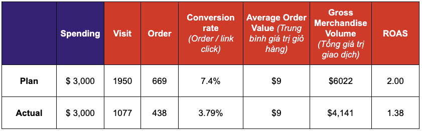ROAS thực tế tuy không đạt kỳ vọng so với mục tiêu, nhưng mức 1.38 cho ngành Thực phẩm là một mức ổn vì ROAS benchmark trong ngành này thường dao động ở khoảng 1.2 – 2.0.