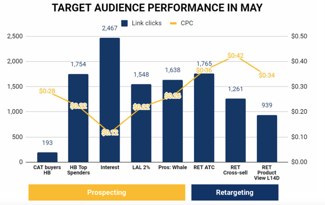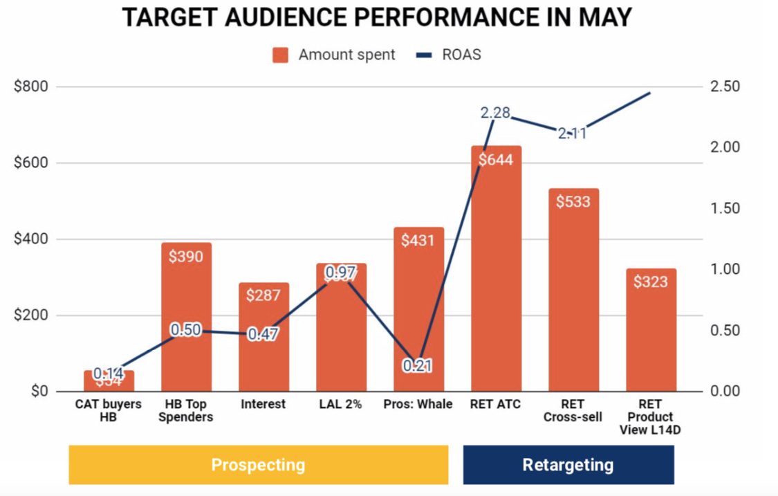 ROAS của nhóm prospecting thấp hơn hẳn ROAS của nhóm retargeting, nhóm đối tượng mới thì khó ra quyết định mua hàng.
