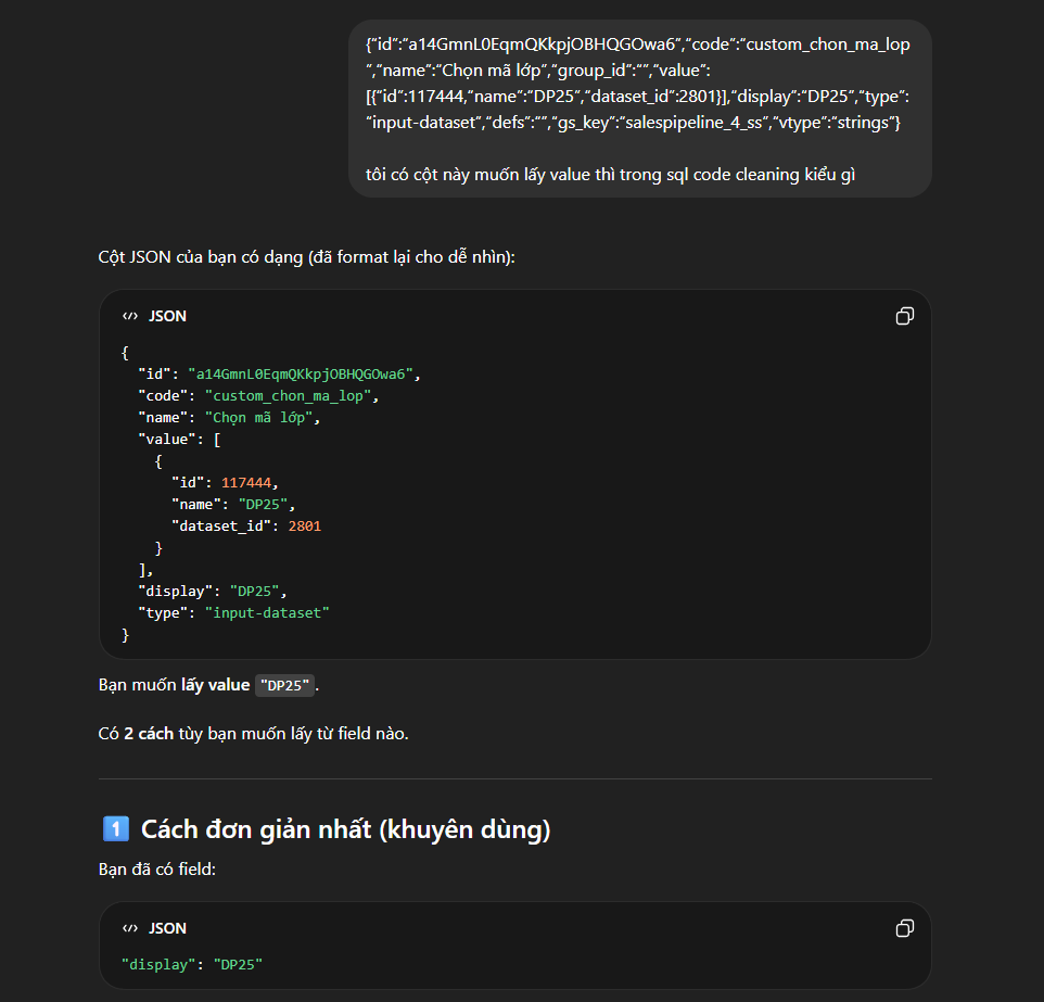 Thậm chí sau này khi mình tự học thêm về Data Engineer, phải làm thêm phần transform data để build pipeline, có những structure data khá phức tạp như JSON, mình cũng thường nhờ AI xử lý hoặc suggest cho mình viết.