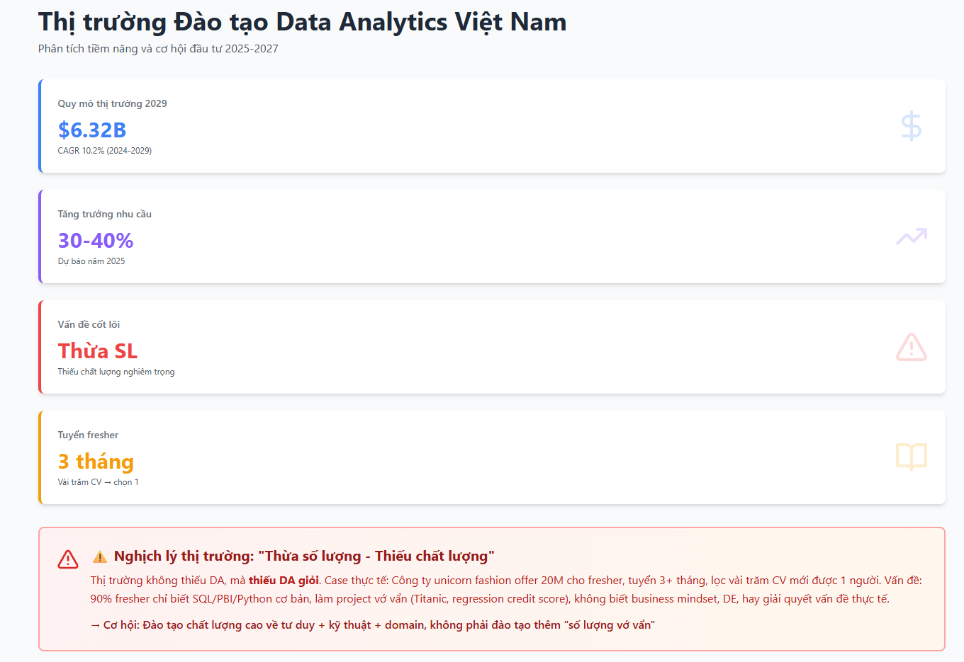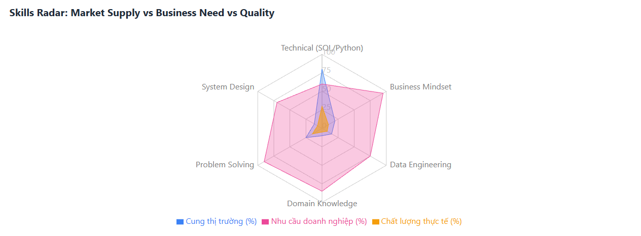Trước đây, chỉ cần giỏi technical, biết SQL, biết Power BI, làm vài dashboard là có thể apply DA. Nhưng bây giờ những thứ đó gần như đã trở thành baseline, vì AI có thể làm được hết (nhưng không đồng nghĩa với việc mình không học nha :))) mình vẫn thuộc trường phái dù có AI làm bạn vẫn phải học căn bản).