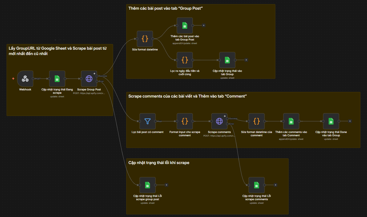 Ví dụ đây là một workflow để craw thông tin các bài post & comment trong các group Facebook mà mình học được trong khóa AI Marketing ở cty mình mà chẳng cần dùng đến Python.