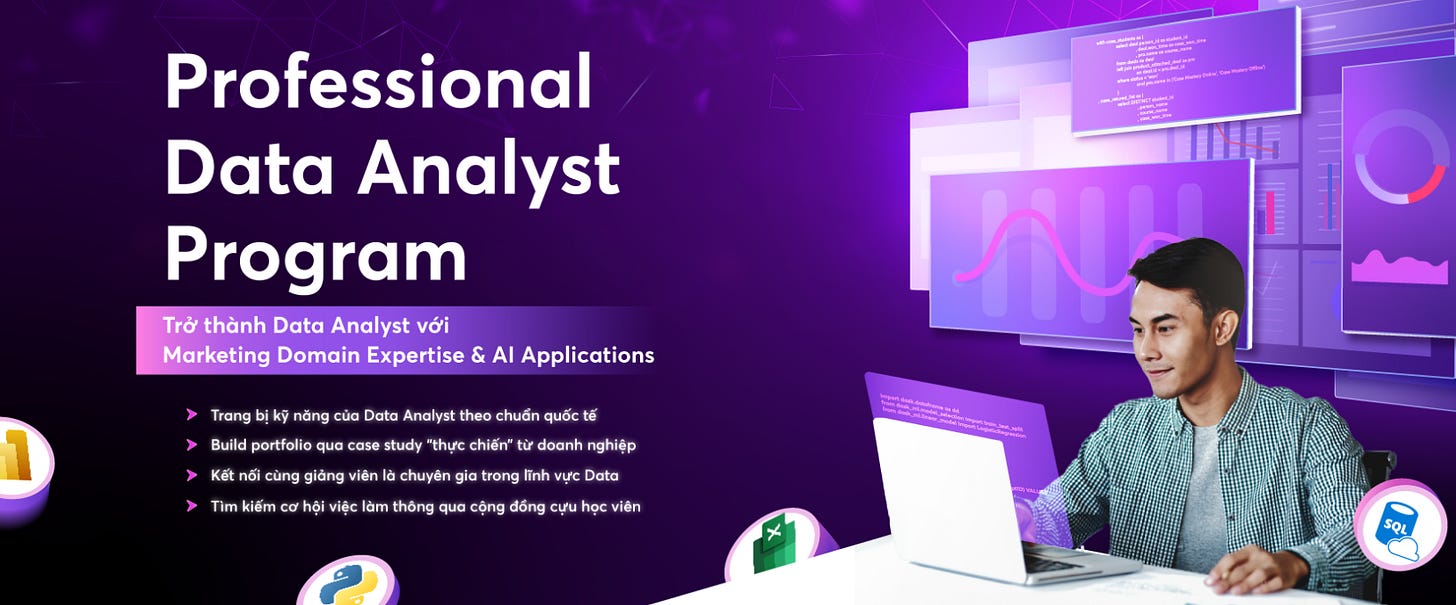 Nếu bạn đang muốn tham khảo một lộ trình học Data Analyst một cách bài bản, trang bị đủ các kiến thức & kỹ năng cần thiết để vào ngành Data trong thời AI, hãy tham khảo Professional Data Analyst Program của TM Data School nha!