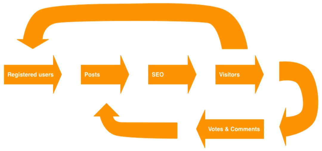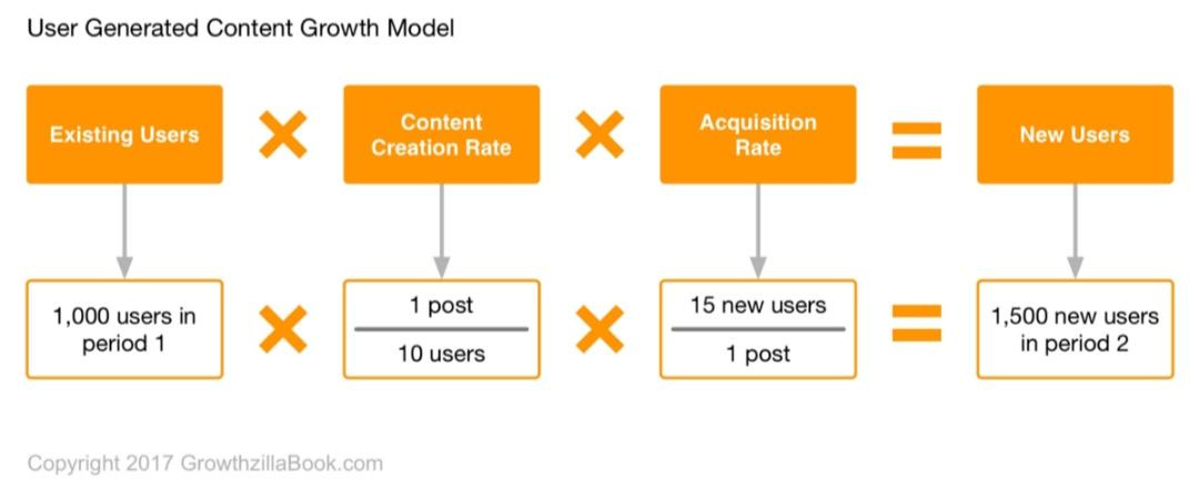 Giả sử, doanh nghiệp có 1,000 người dùng của một forum trong giai đoạn đầu tiên. Phần lớn những người dùng này sẽ chỉ tiêu thụ nội dung, trong đó, trung bình, một nội dung sẽ phục vụ được 10 người dùng. Một nội dung này sẽ được lập chỉ mục tìm kiếm bởi Google, và mỗi nội dung mới sẽ thu hút 15 người dùng mới khi họ tìm kiếm một chủ đề có liên quan. Như vậy, trong giai đoạn thứ hai, doanh nghiệp sẽ có 1,500 người dùng mới và tổng tất cả là 2,500 người dùng, sau đó quy trình thu hút người dùng mới này sẽ lặp đi lặp lại.