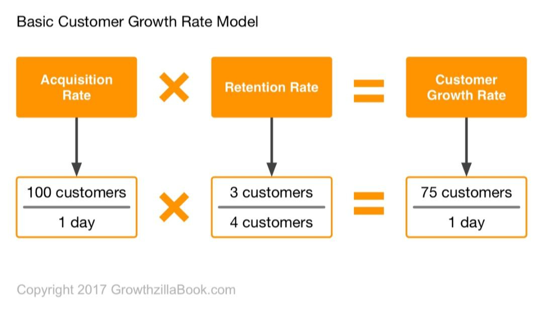 Thứ hai, tỷ lệ giữ chân khách hàng (retention rate) thường là một hàm của thời gian, khi mà thời gian càng trôi qua, càng có nhiều khách hàng từ bỏ doanh nghiệp nếu doanh nghiệp không có bất kỳ hoạt động nào để giữ chân họ. Do đó, điều quan trọng là phải so sánh acquisition rate và retention rate trong cùng một khoảng thời gian để có được đánh giá chính xác về tốc độ tăng trưởng tổng thể.