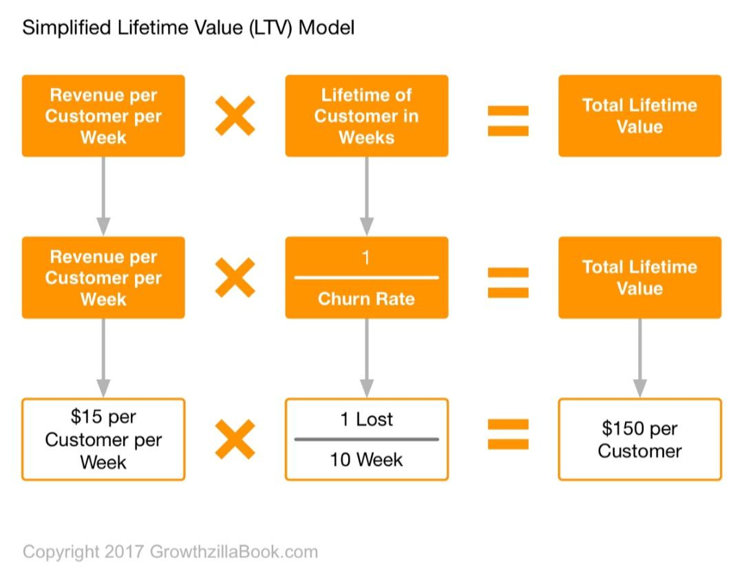 Mô hình này giúp chúng ta nhìn thấy giai đoạn có cơ hội tiềm năng để tạo ra nhiều doanh thu hơn bằng hai cách: tăng giá trị giao dịch của khách hàng trong một giai đoạn nhất định hoặc kéo dài thời gian của vòng đời khách hàng. Ví dụ, trung bình một khách hàng tiêu dùng 15$ cho các sản phẩm/dịch vụ, và họ có xu hướng còn quay lại với doanh nghiệp trong khoảng 10 tuần (tỷ lệ khách hàng rời bỏ hay churn rate ở đây là 10 tuần). Điều này có nghĩa là một giá trị vòng đời khách hàng trung bình là 150$/khách hàng.