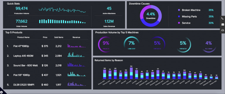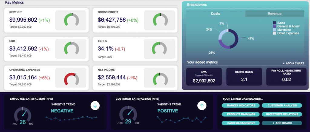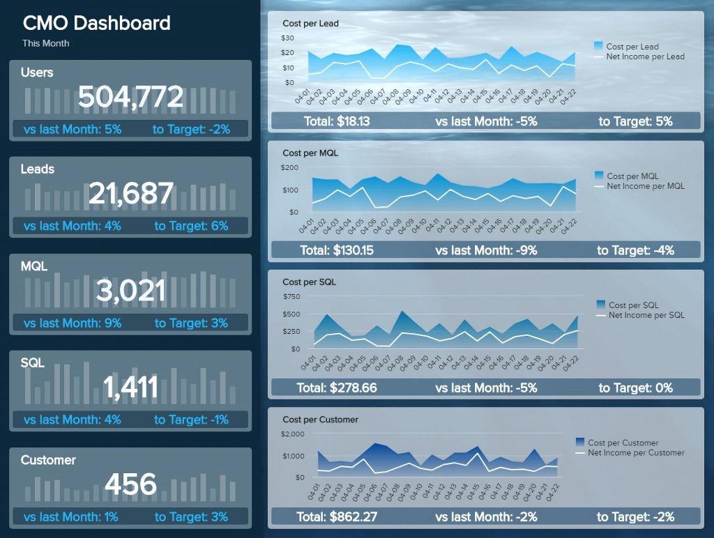 Dashboard này được thiết kế để các giám đốc marketing nắm được bức tranh tổng quan về các chỉ số quan trọng, đánh giá xem họ đã hoàn thành được bao nhiêu phần trăm mục tiêu trong tháng. Cụ thể, bảng báo cáo này đưa ra các biểu đồ dữ liệu về doanh thu, chi phí, thu nhập ròng và thu nhập ròng trên mỗi khách hàng. Các số liệu này đều được so sánh với giai đoạn trước đó để họ có thể biết được sự giao động. Thêm vào đó là các thông tin không kém phần quan trọng về lượng người dùng, lượng khách hàng, khách hàng tiềm năng team sales (SQLs), khách hàng tiềm năng team marketing (MQLs), nhằm giúp các nhà quản lý nắm được bức tranh vận hành và xu hướng tổng quan. Từ đó, họ có thể điều hướng kết quả ở tầm chiến lược, đưa ra các quyết định mang lại lợi nhuận cho doanh nghiệp theo cấp số nhân.