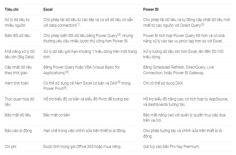 Trước khi đi sâu vào so sánh chi tiết, chúng ta hãy nhìn qua một số tiêu chí quan trọng để thấy được sự khác biệt giữa Power BI và Excel: