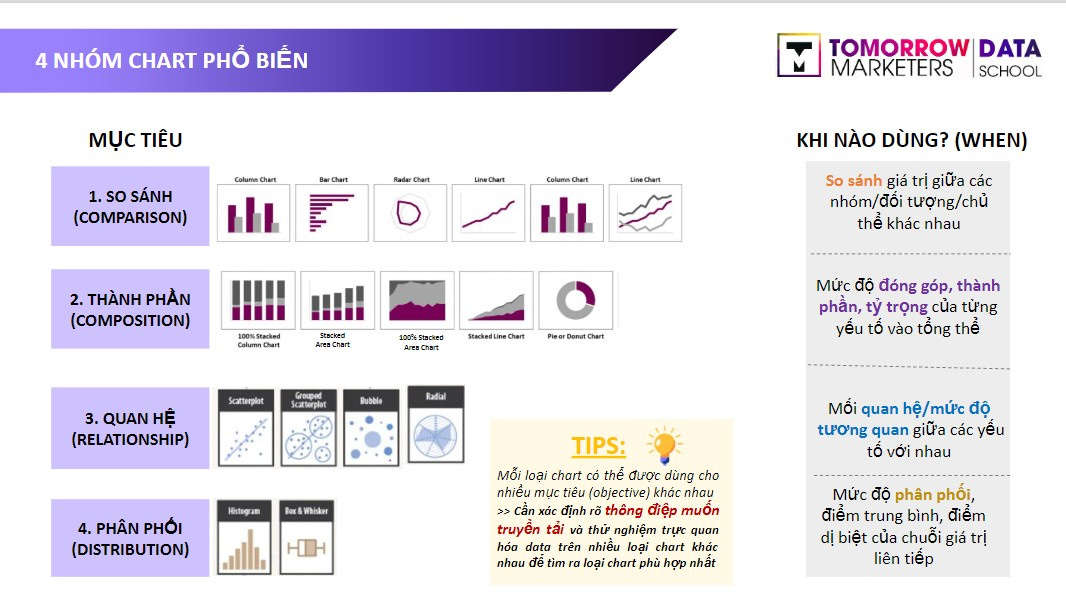 4 nhóm chart phổ biến và khi nào nên sử dụng - Slide khóa học Data Analysis with Power BI | Tableau