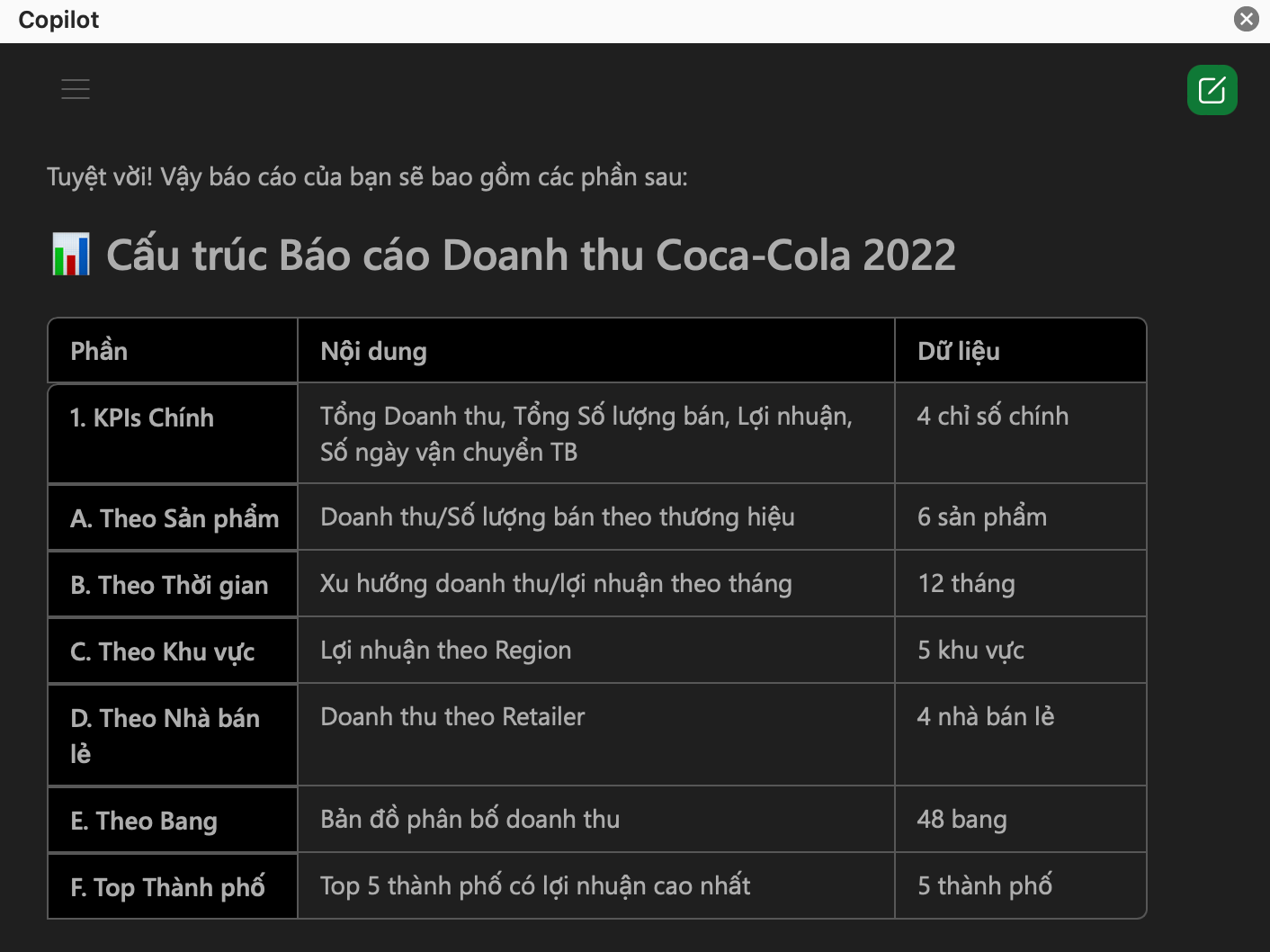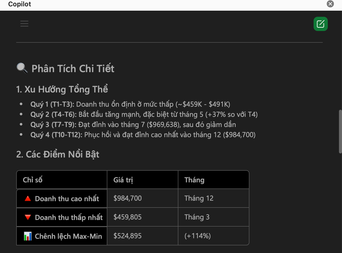 Sau khi đã có dashboard hoàn chỉnh, mình thử tận dụng Copilot thêm một bước nữa là nhờ AI phân tích xu hướng và đưa ra insight.