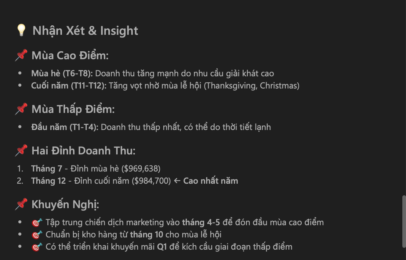 Tuy nhiên, khi đọc kỹ kết quả, mình thấy phần lớn insight vẫn đang dừng ở mức khá “bề mặt”, ví dụ như tập trung vào sản phẩm bán tốt hơn, đẩy mạnh khu vực hiệu quả hay cải thiện vận hành để tối ưu kết quả. Những nhận định này không sai, nhưng cũng chưa đủ sâu để có thể dùng trực tiếp cho việc ra quyết định.