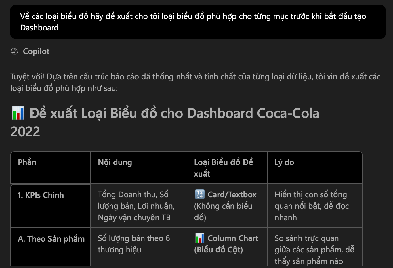 Thay vì phải suy nghĩ biểu đồ nào phù hợp, mình nhờ Copilot gợi ý trước bằng prompt: