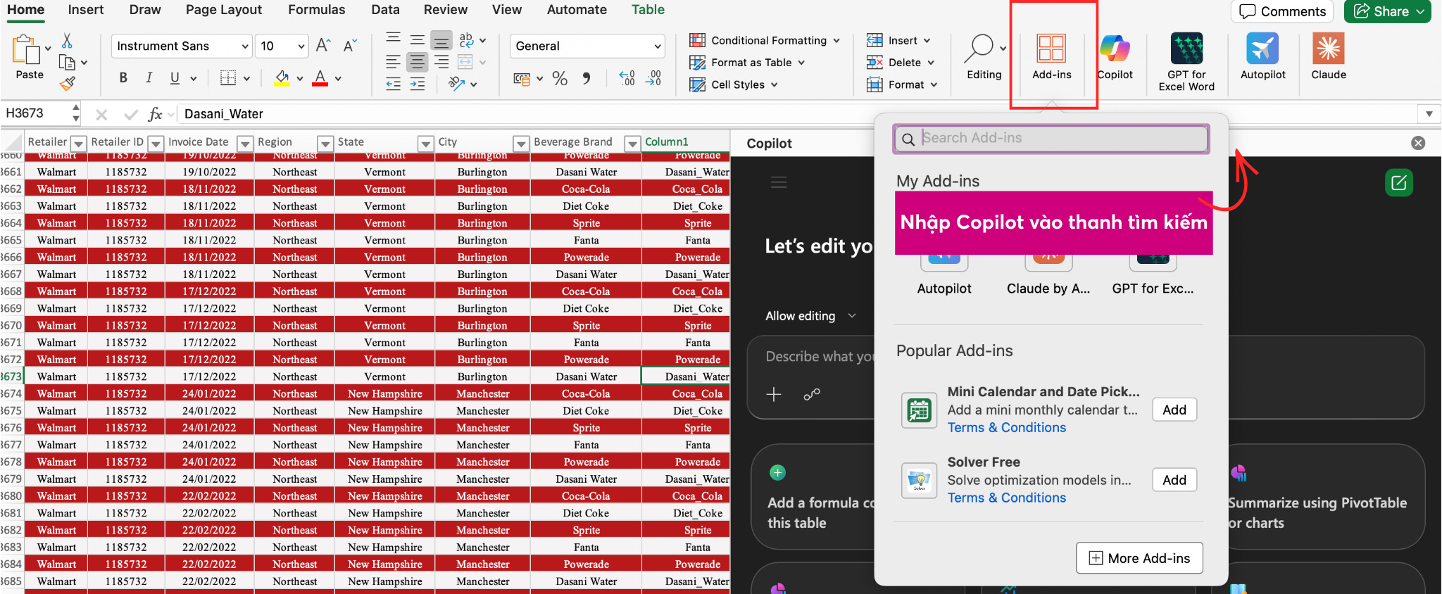 Để sử dụng Copilot trong Excel, mọi người chỉ cần vào tab Home → chọn Add-ins, sau đó nhập “Copilot” vào thanh tìm kiếm. Nếu chưa thấy, bạn có thể bấm vào “More Add-ins”, tìm lại và chọn Add là được.