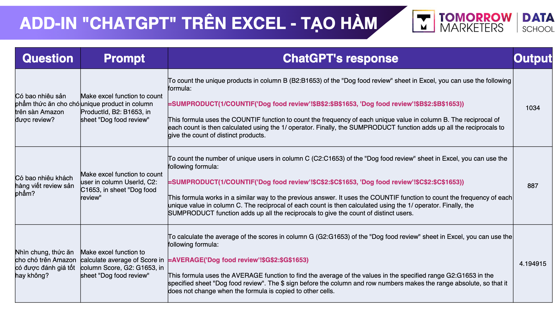 Phần này trong slide của khóa Data Visualization & Analytics with Excel tại TM Data School cũng có hướng dẫn khá chi tiết cách dùng AI để viết công thức và xử lý data, mọi người có thể tham khảo thêm nha!
