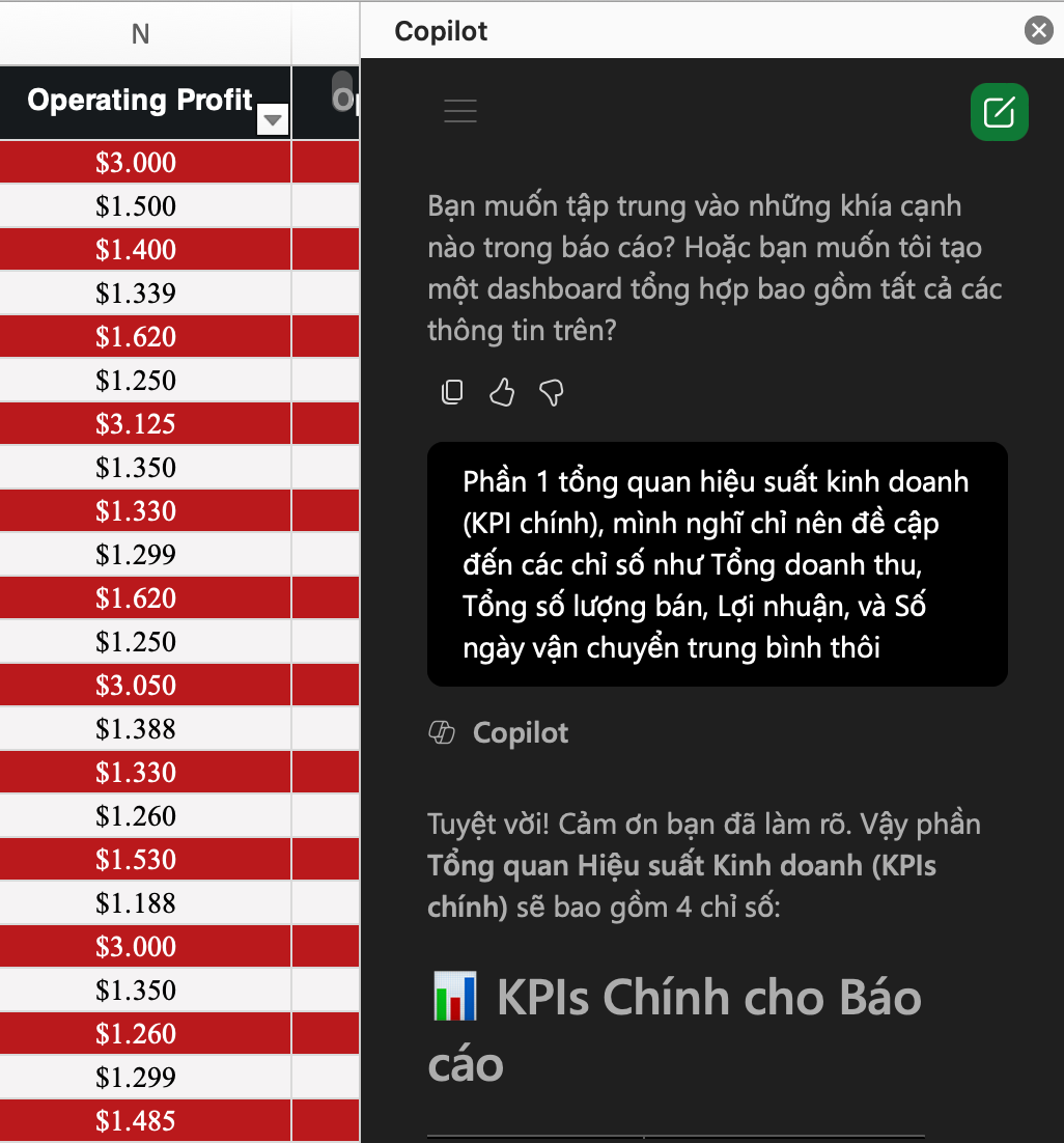 Ví dụ, ở phần KPI chính, Copilot đề xuất khá nhiều chỉ số. Nhưng với mình, chỉ cần những thông tin như: Tổng doanh số, Lợi nhuận, Số sản phẩm bán ra và Số ngày vận chuyển trung bình là đủ. Những chỉ số như biên lợi nhuận mình tạm thời không đưa vào, vì nó chưa thực sự cần thiết cho bài toán này.