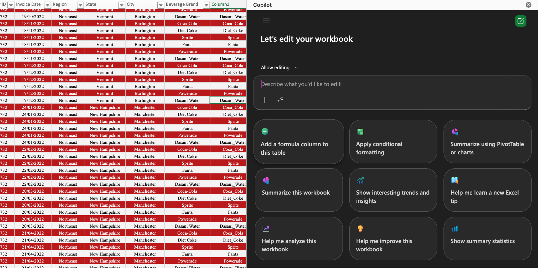 Quay trở lại với dataset của mình, thay vì mở file ra và làm pivot table ngay, mình chọn cách bắt đầu bằng việc nhờ Copilot đề xuất trước.