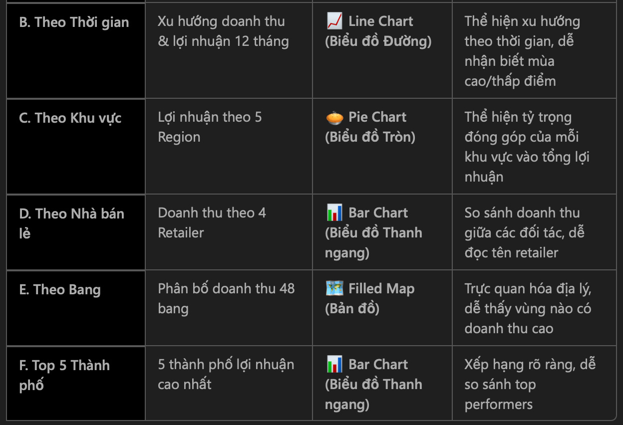 Sau khi đã xác định được các mục cần có trong dashboard, mình chuyển sang bước tiếp theo là chọn biểu đồ phù hợp cho từng loại thông tin.