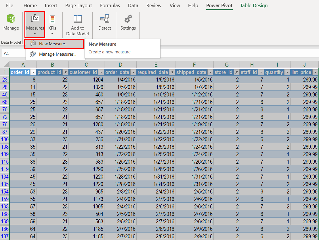 Chọn bảng dữ liệu mà bạn muốn tạo Measure. Ở đây, chúng ta sẽ tạo DAX Measure chọn bảng Order_Details. Chọn Power Pivot > Measures > New Measure.