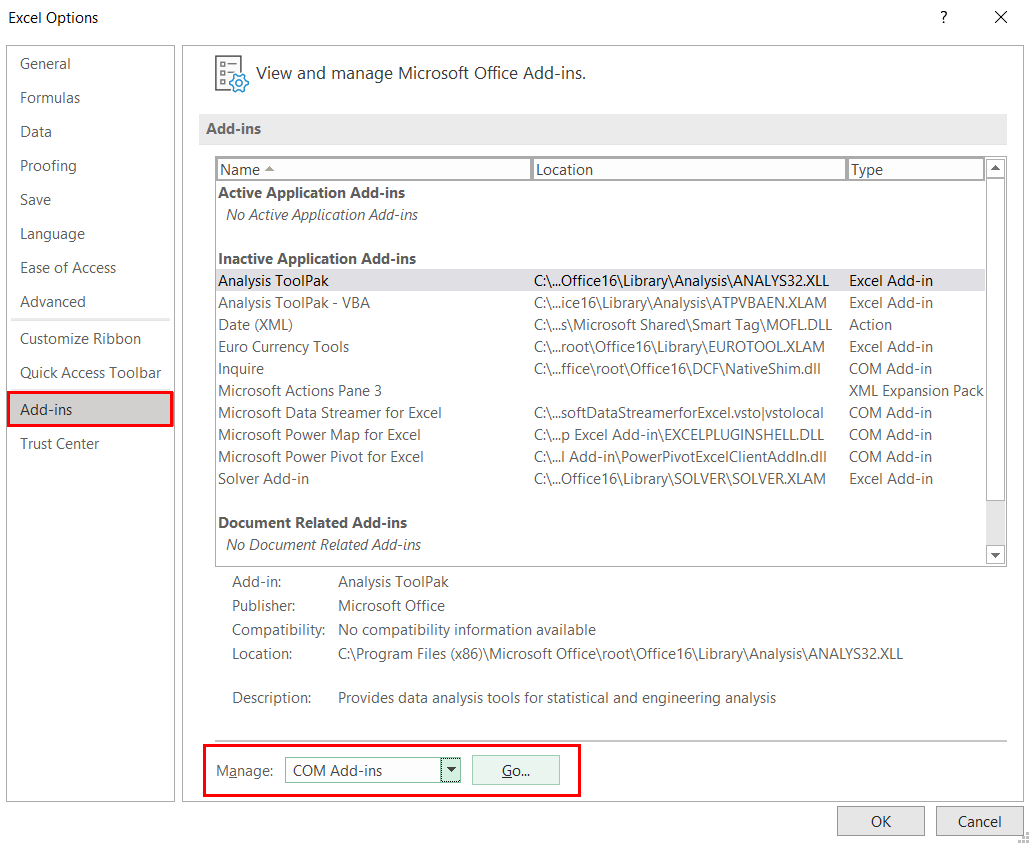 Để bật tính năng Power Pivot, truy cập vào tab File > Options > Add-ins. Ở phía dưới, trong mục Manage, chọn COM Add-ins và nhấn Go