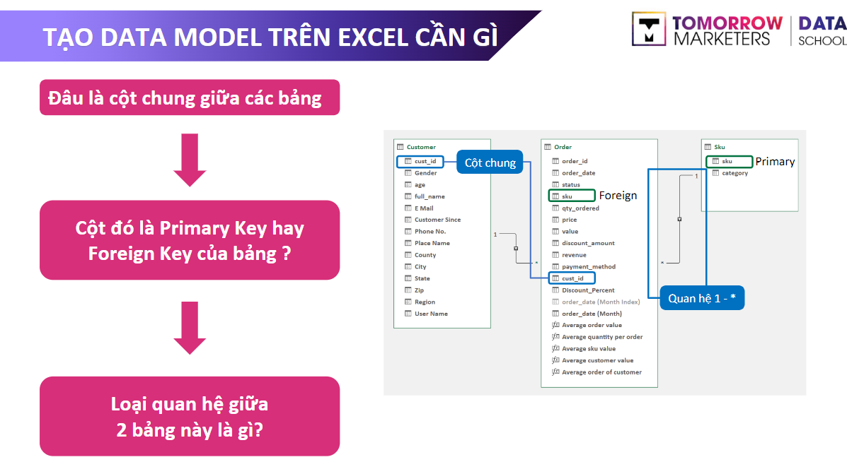 Để xác định được mối quan hệ giữa các bảng bạn sẽ cần có kiến thức về Primary Key & Foreign key, mối quan hệ giữa các bảng. Bạn có thể tìm hiểu thêm kỹ hơn về những kiến thức này trong khóa Data Visualization & Analytics with Excel.