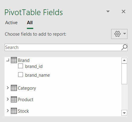 Trong PivotTable Field List, bạn sẽ thấy tất cả các bảng và các cột từ Data Model của mình.
