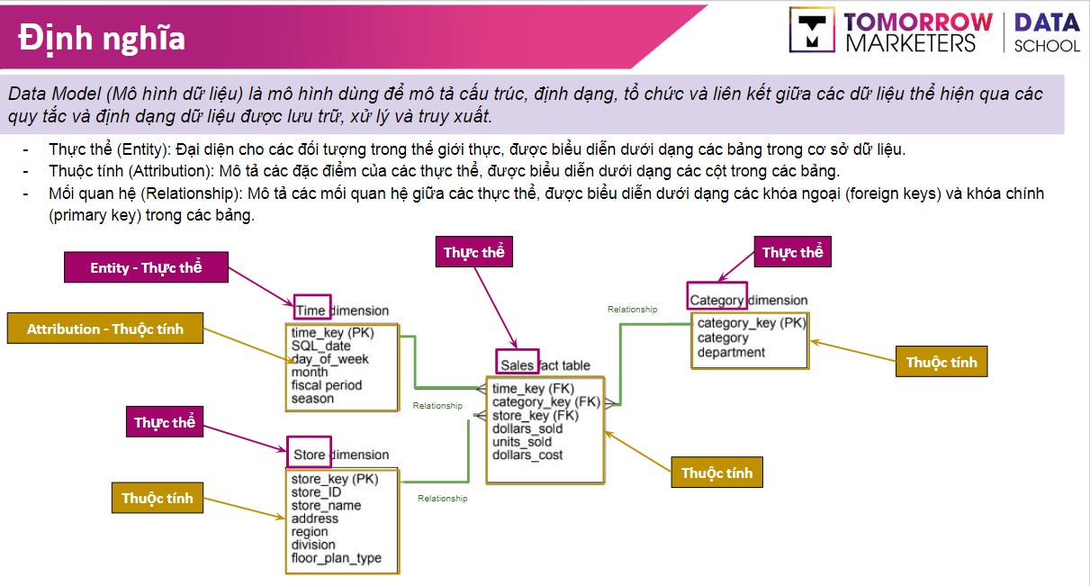 Entities (Thực thể): Là các đối tượng mà chúng ta muốn biểu diễn trong Data Model và thường được đại diện bằng bảng. Ví dụ: khách hàng, đơn hàng, sản phẩm, hoặc danh mục.
