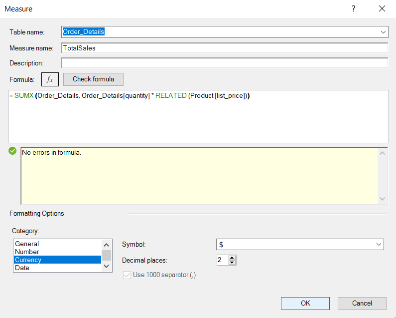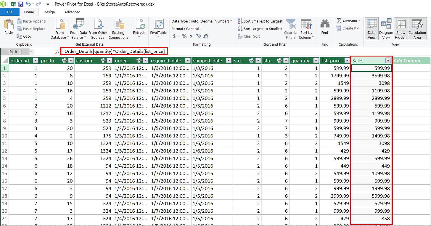 TotalSales = SUMX (Order_Details, Order_Details[quantity] * RELATED (Product [list_price]))
