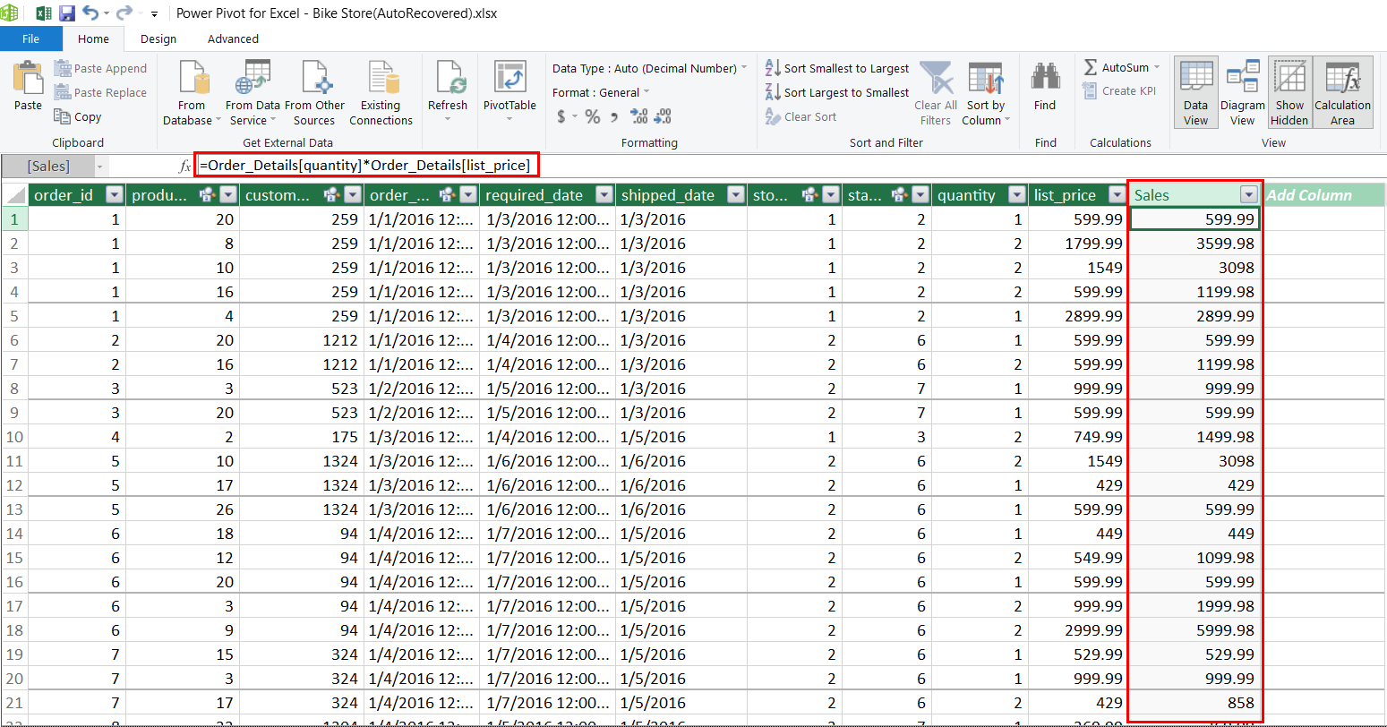 Để kiểm tra tính chính xác của DAX Measure TotalSales, chúng ta sẽ tạo thêm một cột Sales trong bảng Order_Details mà không sử dụng DAX, sau đó so sánh kết quả giữa hai phương pháp.