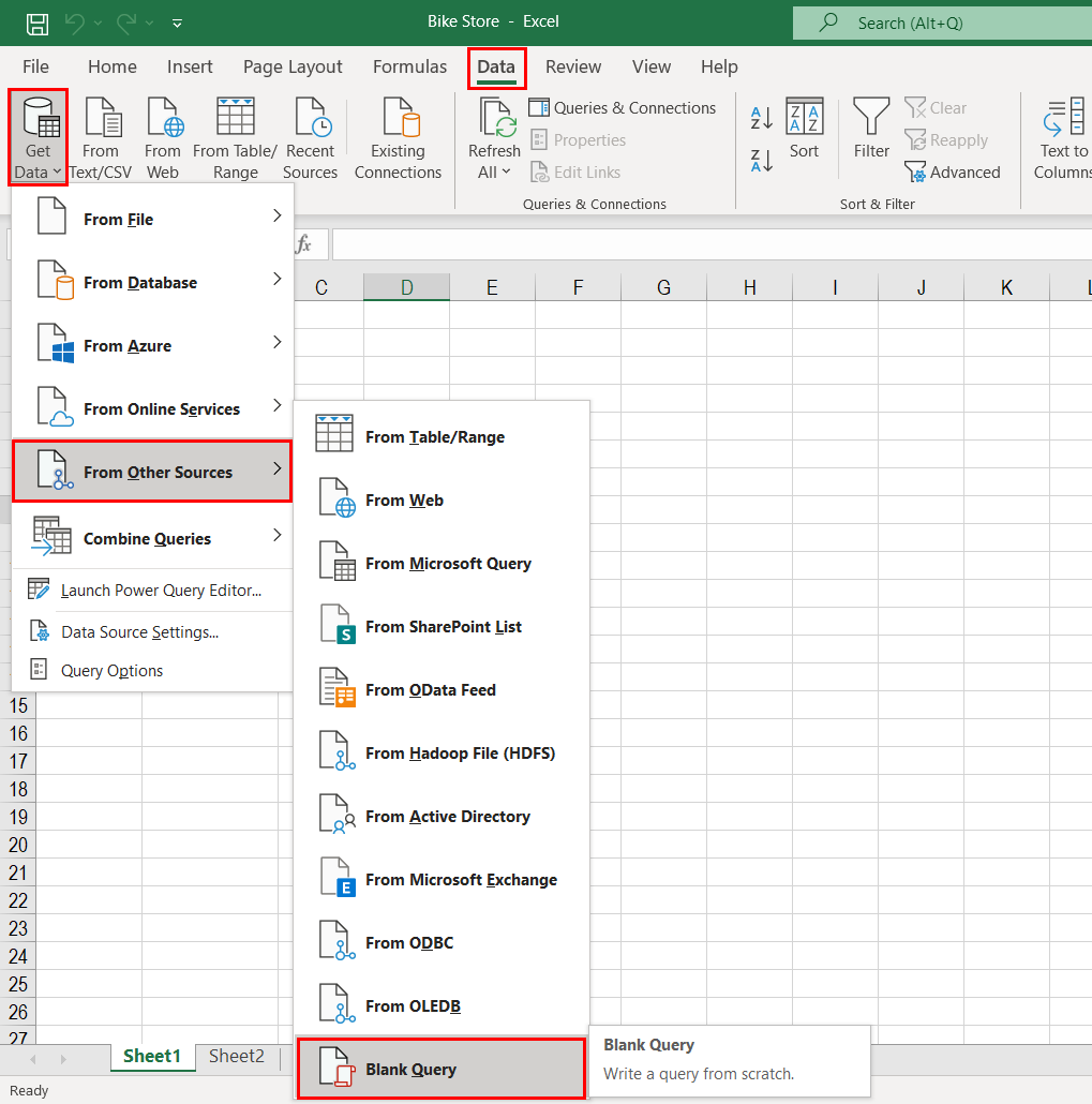 Mở file Dataset đã tải về, chọn tab Data. Tiếp tục chọn Get Data > From Other Sources > Blank Query.