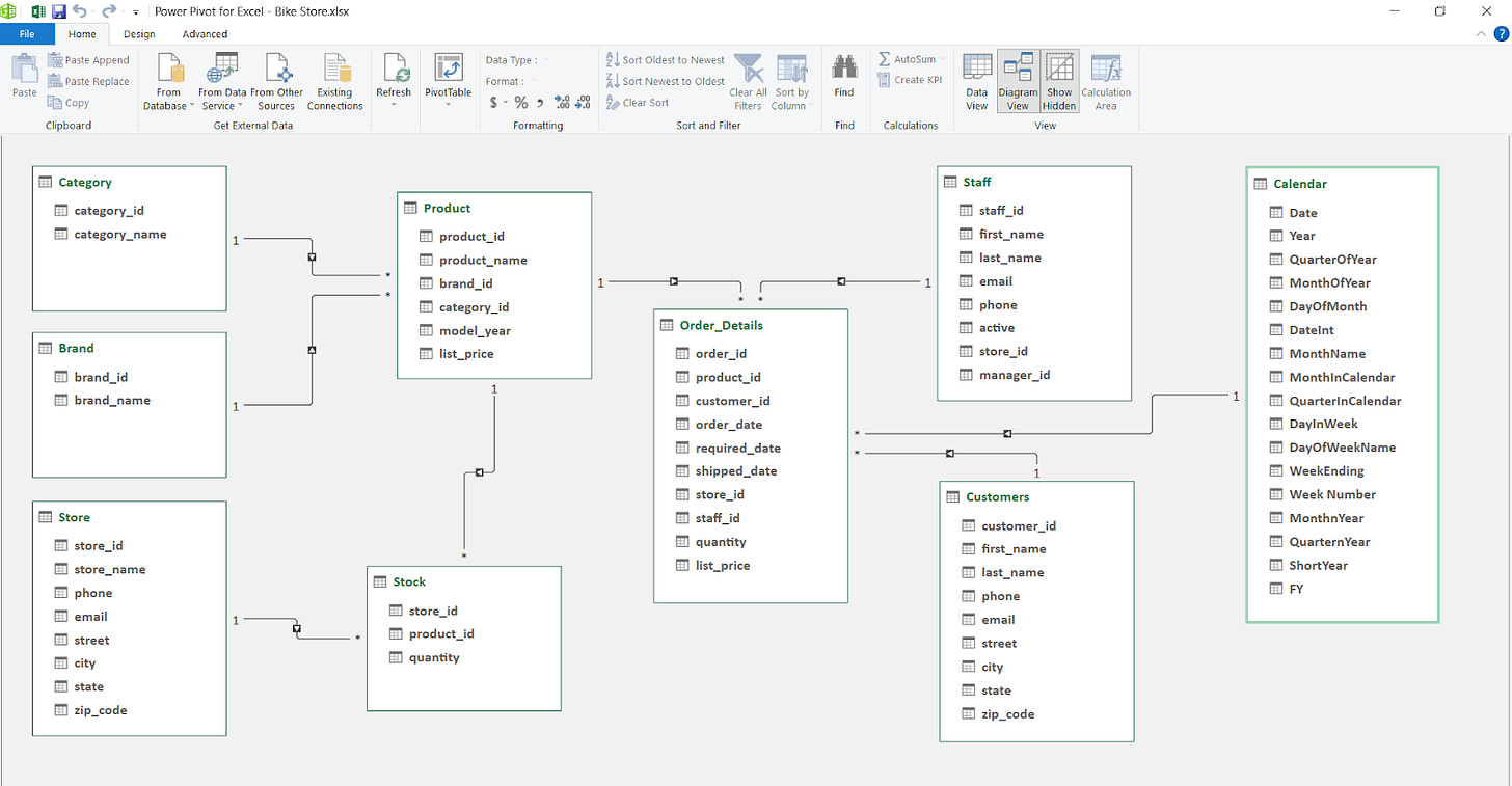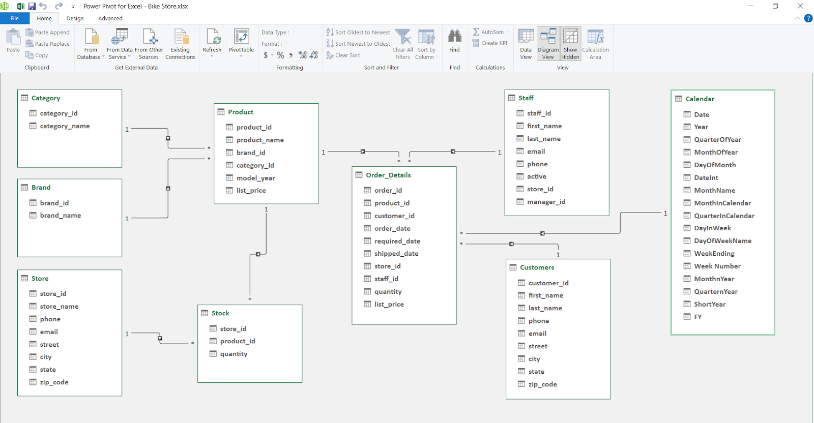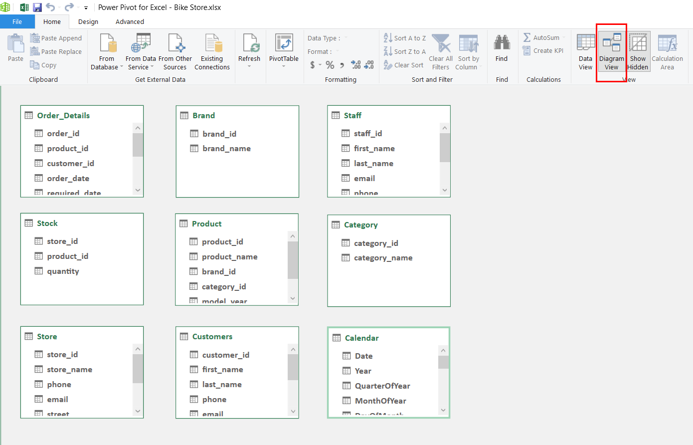Sau khi đã thêm các bảng vào Data Model, trong cửa sổ Power Pivot, chọn Diagram View để xem tất cả các bảng dữ liệu dưới dạng sơ đồ.