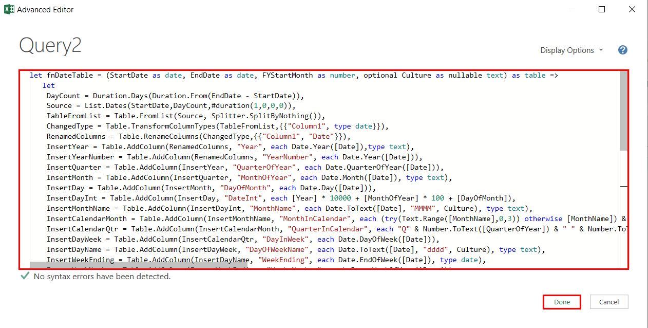 Vì bài viết không đi sâu vào Power Query M formula trong Excel nên TM Data School sẽ cung cấp sẵn cho bạn đoạn code để tạo bảng tại đây. Paste đoạn code để tạo bảng Calendar vào Advanced Editor như hình minh họa dưới đây, sau đó chọn Done.
