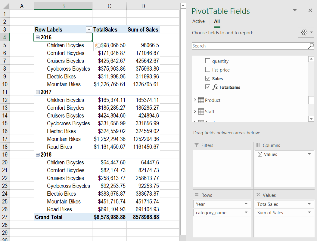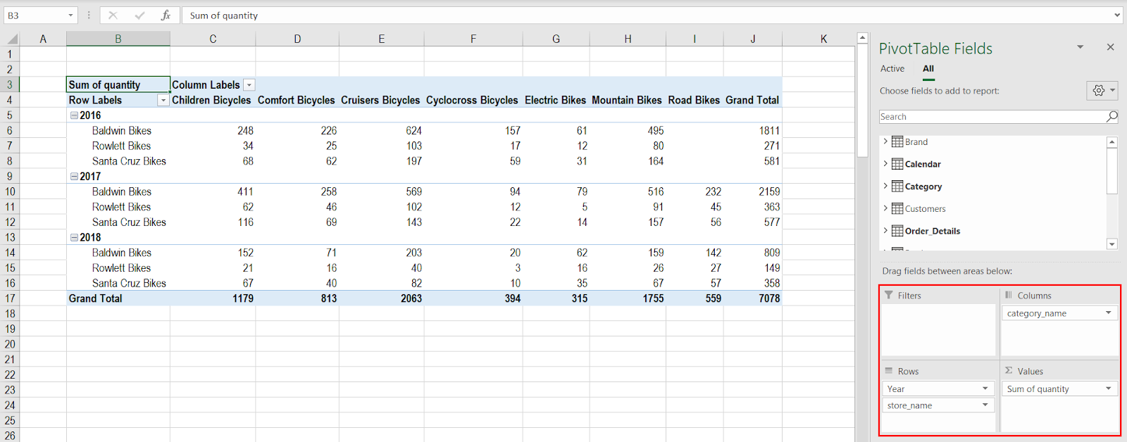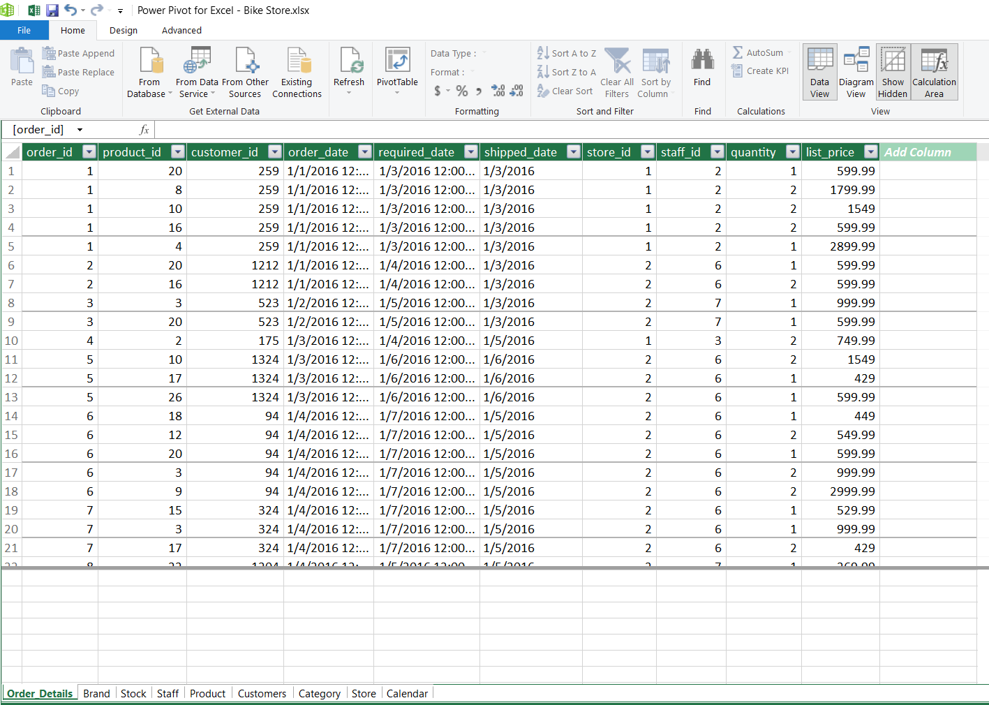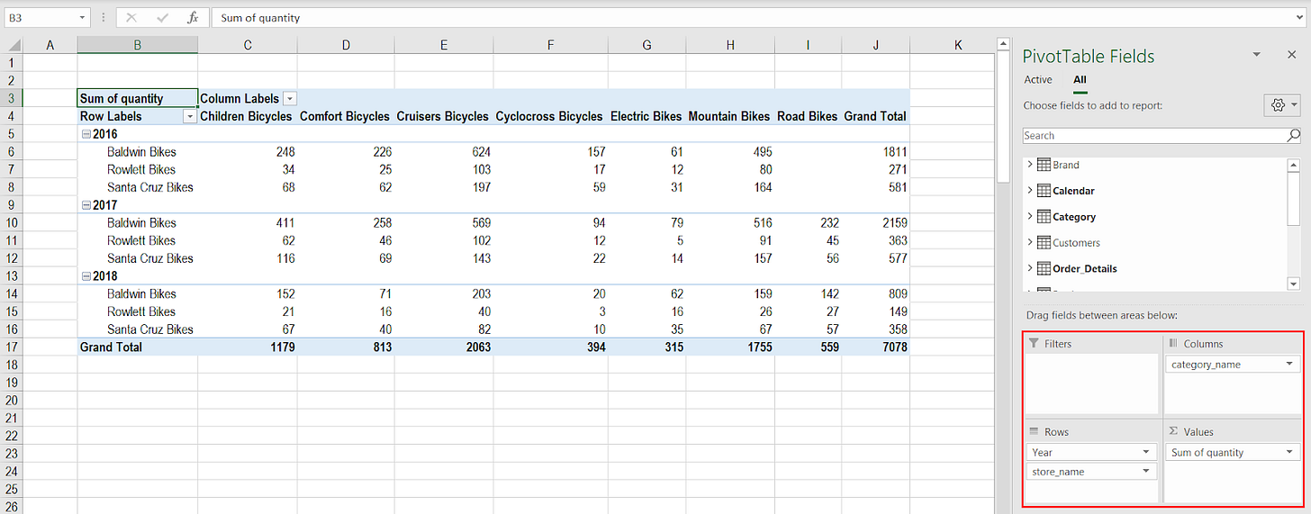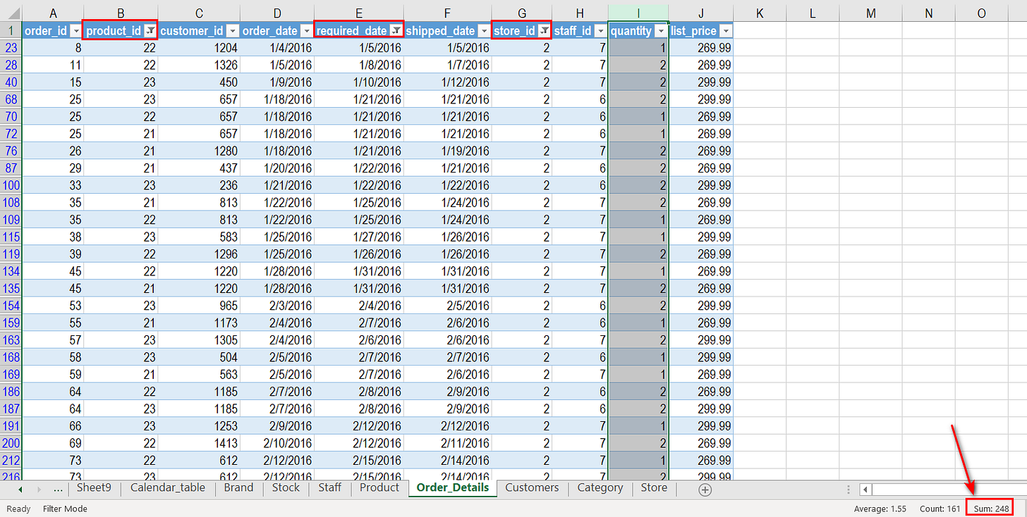 Ví dụ: Trong năm 2016, có 248 sản phẩm thuộc Category Children Bicycles bán được ở cửa hàng Baldwin Bikes. Filter và tính toán dữ liệu ở bảng gốc, chúng ta cũng ra được con số 248 sản phẩm. Có thể thấy Data Model vừa liên kết đang hoạt động và trả về kết quả đúng.