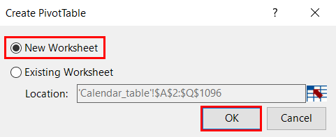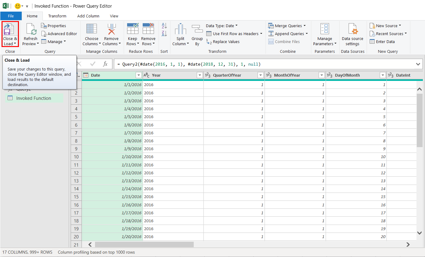 Đóng và tải bảng Calendar vào Excel bằng cách chọn Close & Load.