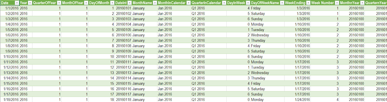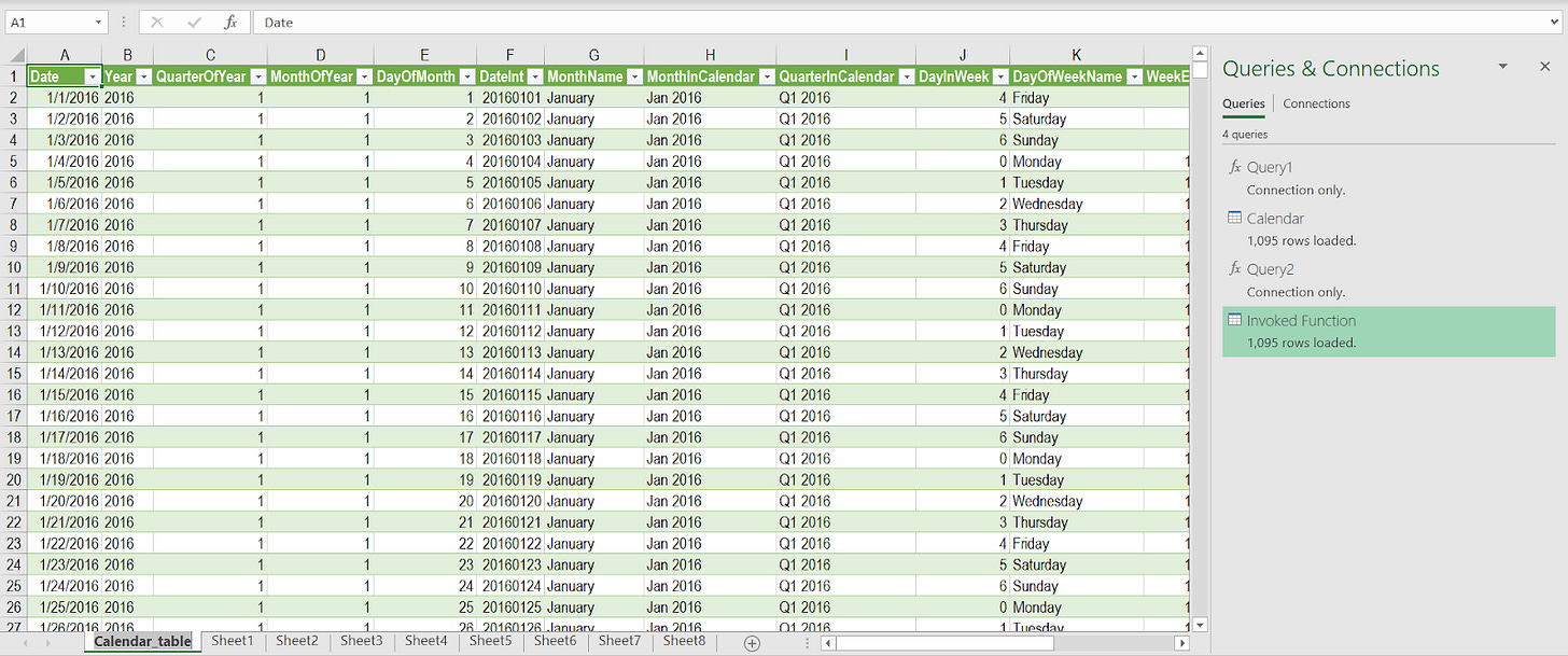Bảng Calendar của bạn sẽ xuất hiện trong Excel và sẵn sàng sử dụng để xây dựng Data Model.