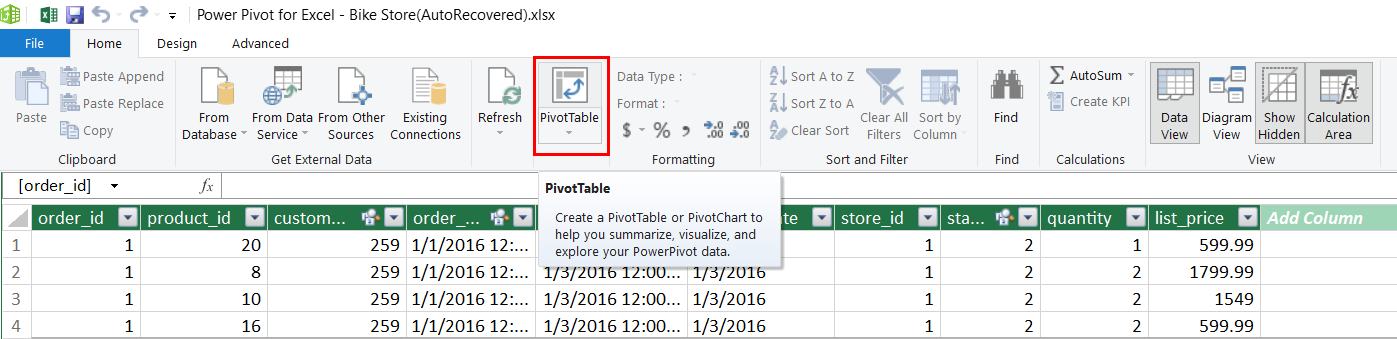 Để tạo PivotTable, ở trong cửa sổ Power Pivot for Excel, chọn PivotTable