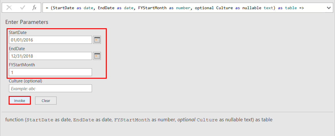 Thay thế StartDate và EndDate bằng ngày bắt đầu và kết thúc mà bạn mong muốn. Ở đây chúng ta sẽ đặt StartDate: 01/01/2016, EndDate: 12/31/2018, và FYStartMonth: 1. Tiếp tục chọn Invoke.