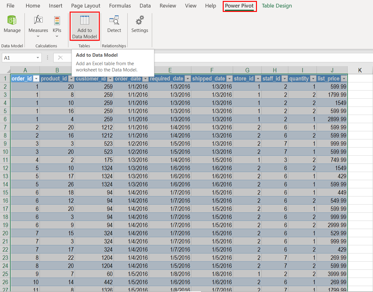 Để thêm bảng vào Data model, chọn bảng muốn thêm, sau đó chọn Power Pivot > Add to Data Model.