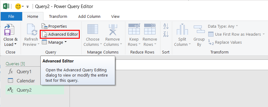 Cửa sổ Power Query Editor sẽ hiện ra, bạn tiếp tục chọn Advanced Editor.