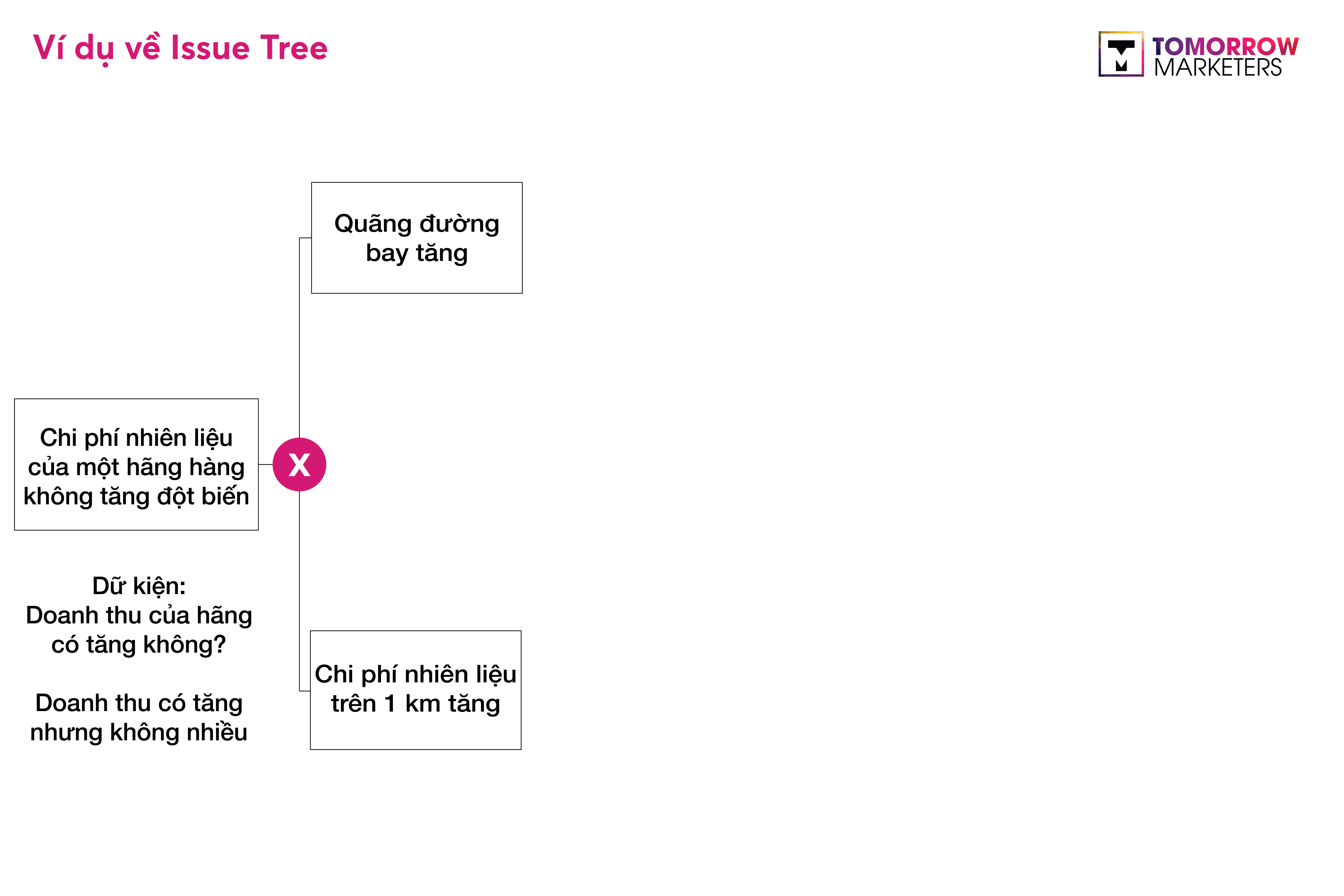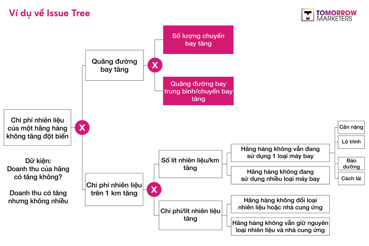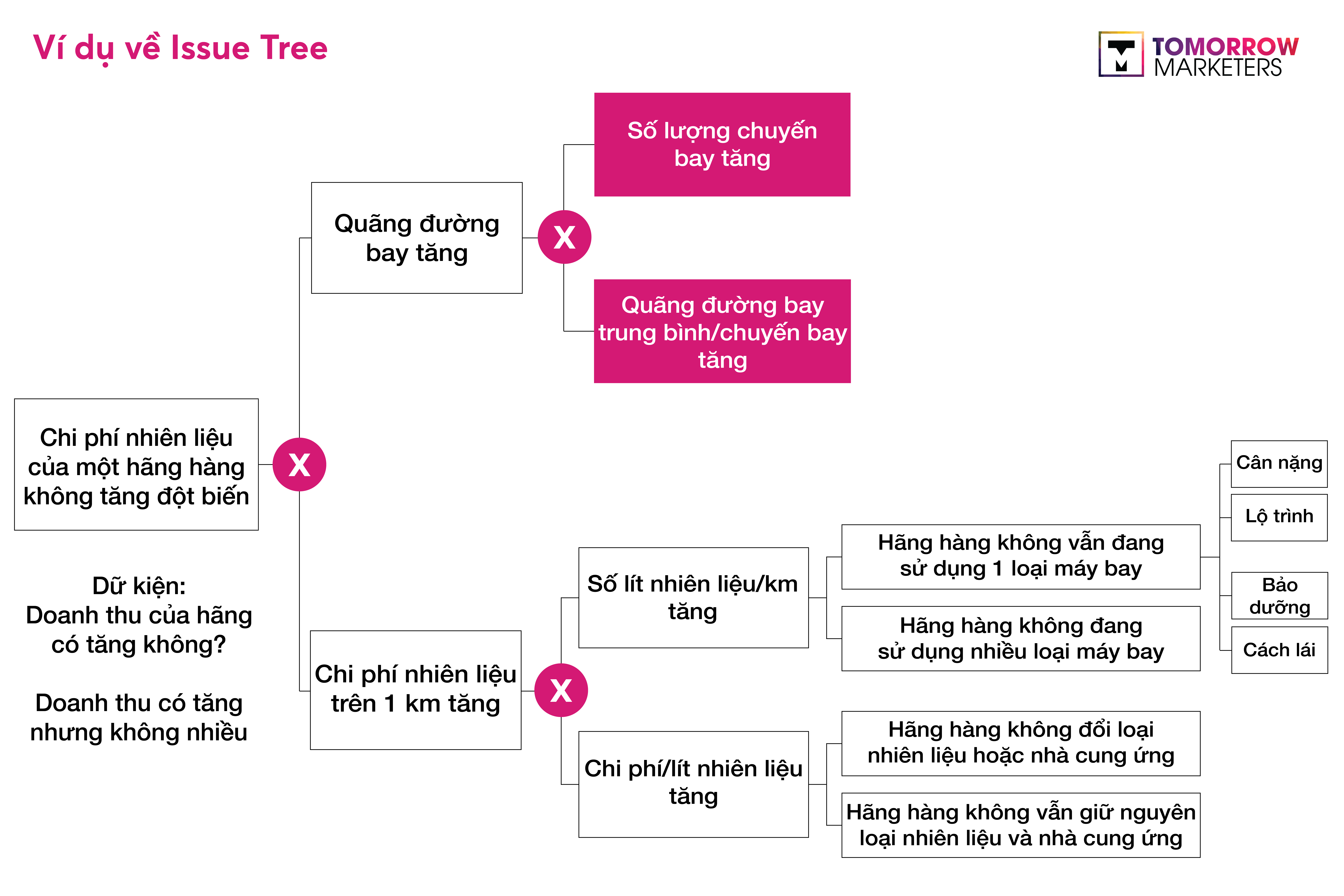Như bạn có thể thấy, ở tầng thứ 2, người lập Issue Tree đã chọn việc không phát triển tiếp các nhóm giả thuyết ở nhánh “Quãng đường bay tăng”.