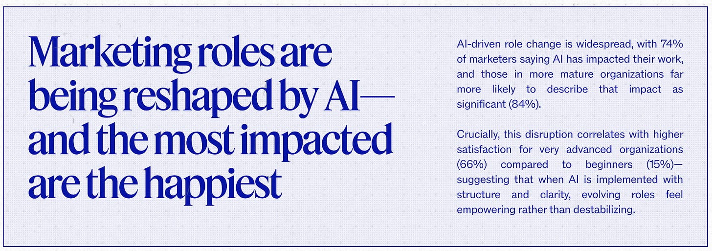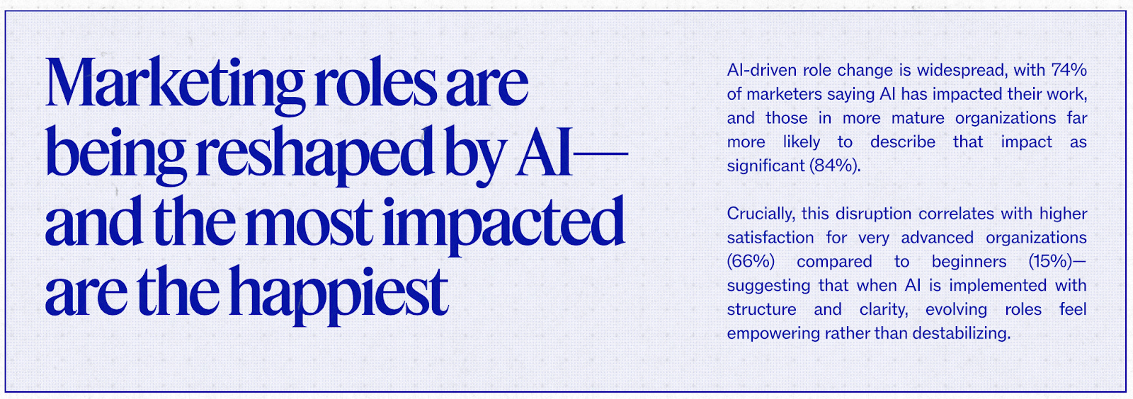 Theo report, 1 trong 3 marketer đã có AI trong JD công việc, và 74% cho biết AI đã ảnh hưởng trực tiếp đến công việc của họ .
