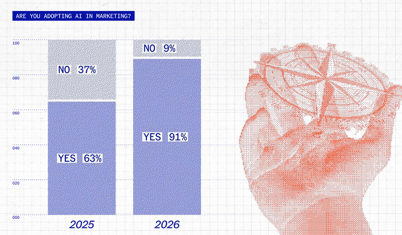 Theo báo cáo, 91% các tổ chức marketing đã ứng dụng AI, tăng đáng kể so với mức 63% của năm 2025. Sự thay đổi này cho thấy AI không còn là một công cụ mới hay chỉ dừng ở giai đoạn thử nghiệm. Thay vào đó, AI đang dần trở thành một công cụ quan trọng trong công việc hằng ngày của marketers.