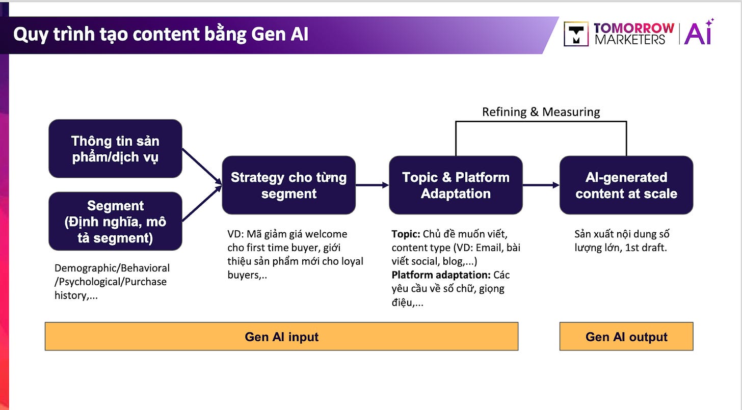 Thay vì chỉ tạo ra một output duy nhất, nhiều marketer bắt đầu sử dụng AI để tạo ra nhiều định dạng nội dung cùng lúc (multi-asset). Đây là một sự chuyển dịch quan trọng: từ việc “làm nhanh hơn một việc” sang “làm nhiều việc cùng lúc”.