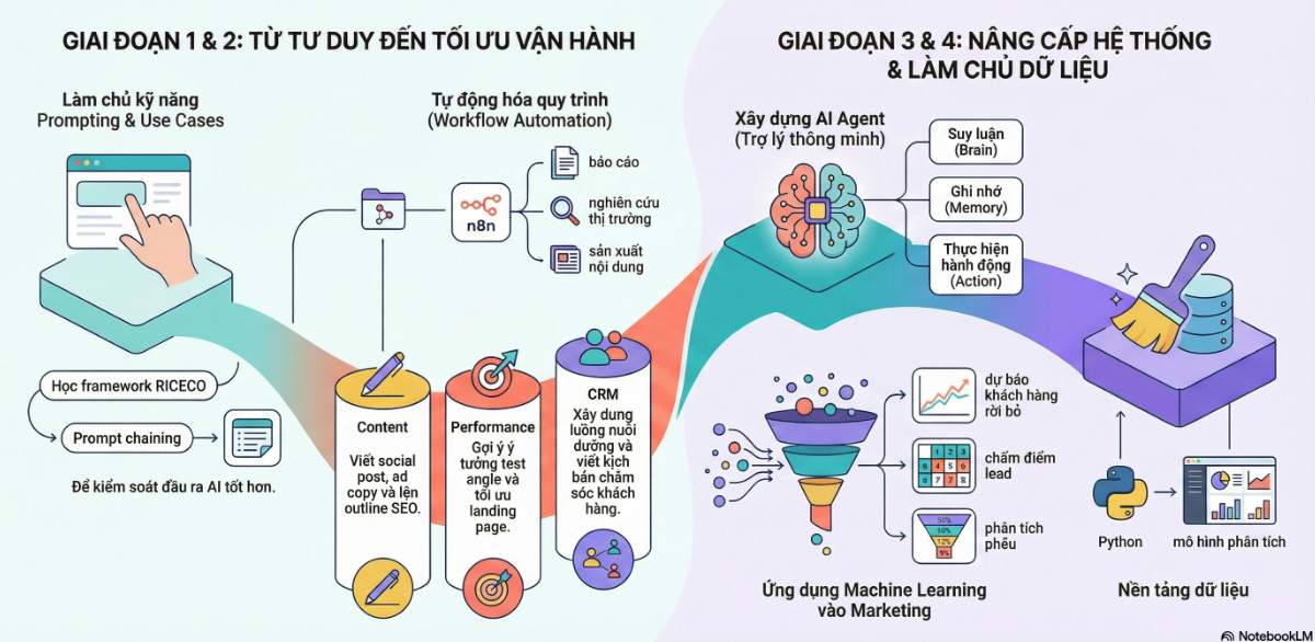 Nếu muốn đi sâu thêm với lộ trình học AI này, đây cũng là giai đoạn hợp lý để bắt đầu tiếp cận với Python hoặc Google Colab. Không nhất thiết phải học code quá nặng, nhưng việc hiểu cách đọc file dữ liệu, xử lý bảng dữ liệu hay trực quan hóa một mô hình phân tích sẽ giúp marketer nhìn AI và data với góc nhìn rõ ràng hơn.
