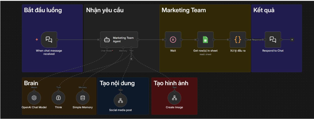 Ví dụ một workflow n8n tự động tạo nội dung và hình ảnh trong lớp Generative AI