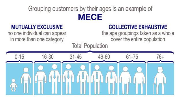 Với cách chia độ tuổi khách hàng như trên, chúng ta đã bao quát được tất cả khách hàng ở tất cả mọi độ tuổi (Collectively Exhaustive) và không cá nhân nào có thể xuất hiện trong nhiều danh mục (Mutually Exclusive). Khoảng cách 15 tuổi trong mỗi nhóm cũng đảm bảo rằng mỗi danh mục khách hàng không quá lớn hay quá nhỏ và giúp việc so sánh các nhóm trở nên dễ dàng hơn.