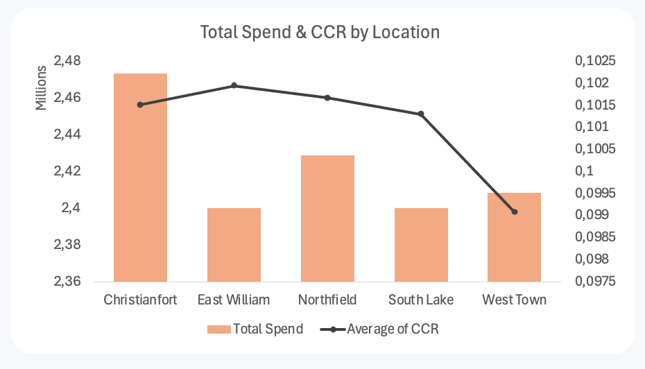 Theo location: Christianfort và Northfield có mức chi tiêu cao, nhưng CCR cao nhất lại nằm ở East William, cho thấy phân bổ ngân sách theo khu vực chưa hoàn toàn tương xứng với hiệu quả chuyển đổi.