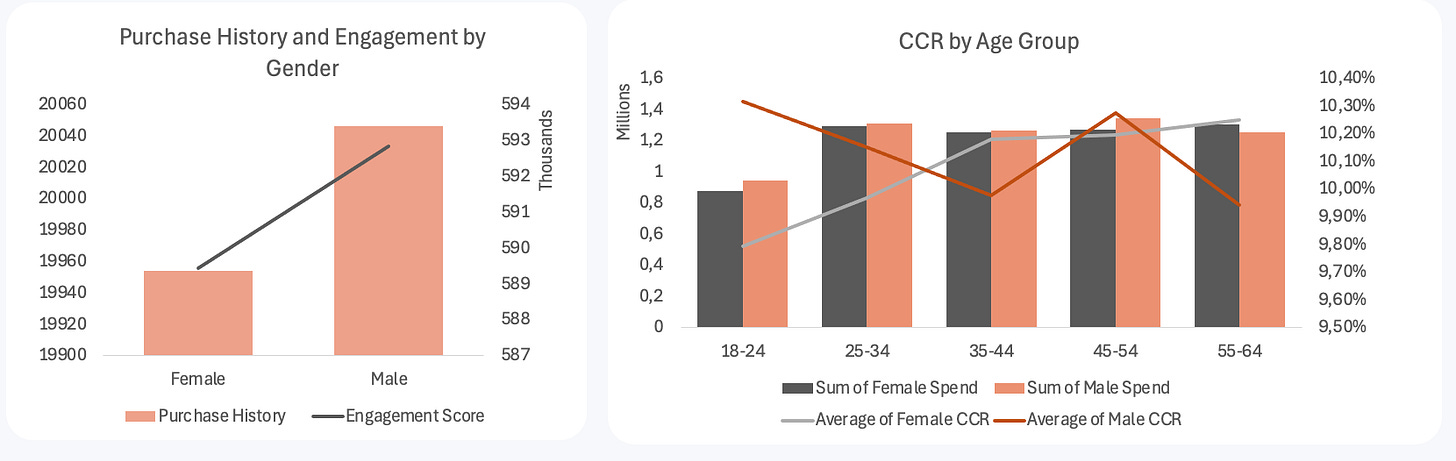 Theo độ tuổi: Nhóm 45–54 có CCR cao nhất, trong khi nhóm 18–24 chi tiêu thấp và chuyển đổi kém hơn; hiệu quả chuyển đổi tăng dần theo độ tuổi.
