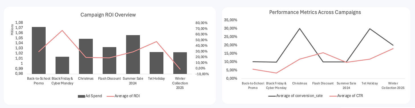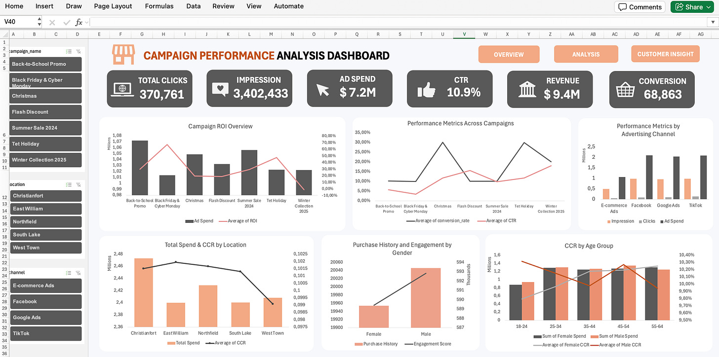 Mày mò làm bài tập suốt 3 ngày 3 đêm (và 7749 công thức Excel sau đó 🥲), cuối cùng mình cũng rút ra được kha khá kinh nghiệm khi làm một bản Dashboard Campaign Performance. Cái mà trước đây mình vẫn hay nghĩ chỉ cần “vẽ vài cái biểu đồ” là xong.
