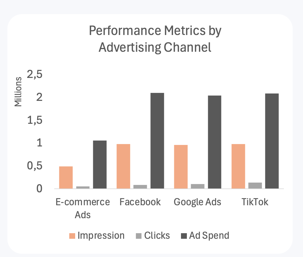 E-commerce Ads có ngân sách, impressions và clicks thấp nhất, cho thấy kênh này chỉ đóng vai trò bổ trợ, không phải kênh chính trong các chiến dịch.