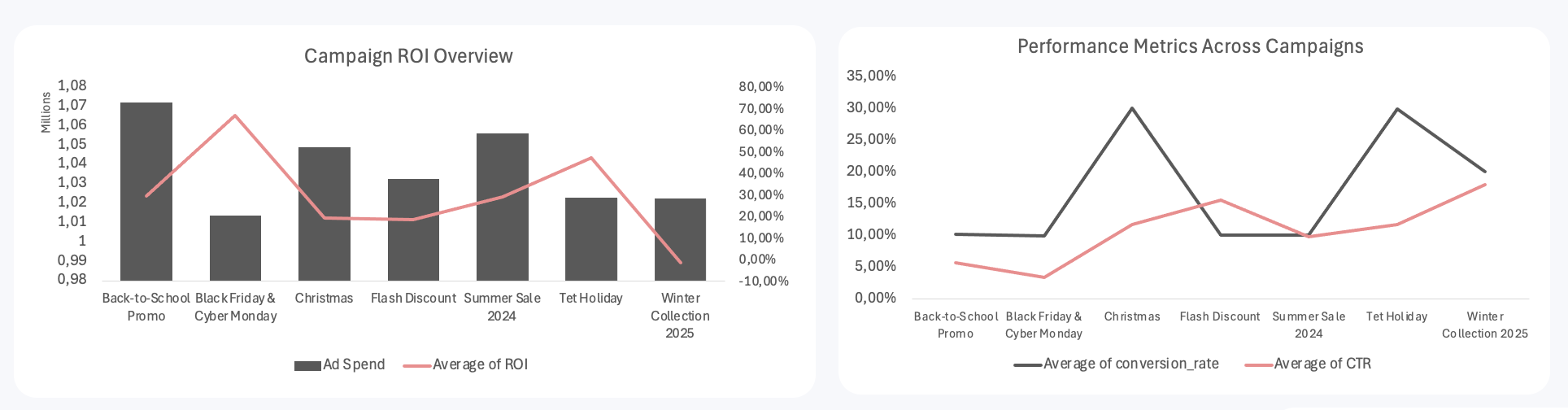 Christmas và Flash Discount có hiệu suất ổn định nhưng không nổi bật: conversion rate và CTR ở mức trung bình, phù hợp vai trò duy trì doanh thu hơn là campaign bứt phá.